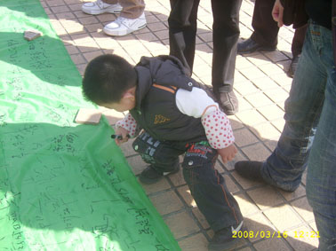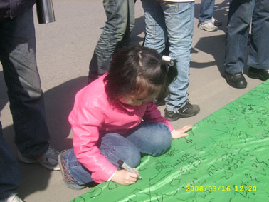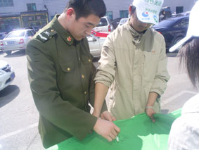 3月16日,為倡議有車族參與本活動,加強對廢油液排放的監(jiān)督,來自奧吉娜、東北大學(xué)、沈陽大學(xué)、中國醫(yī)大的環(huán)保志愿者組成了近千人的宣傳隊,在桃仙機場、北方圖書城、卓展商場、每家瑪、家樂福金牛店、麥德龍展開了宣傳。上午10時,活動現(xiàn)場設(shè)置了“支持回收車用廢棄油液-利國利民利已利后世”條幅和巨幅“迎奧運天藍水清地綠-車用廢棄油液回收活動之沈城十萬駕車者聯(lián)合簽名”錦旗,志愿者現(xiàn)場講解車用油液對環(huán)保的危害,倡議有車人士對隨意排放現(xiàn)象進行監(jiān)督。活動得到有車族的積極響應(yīng)與大力支持,不到半天,已有近萬名應(yīng)倡者在錦旗上簽名,從中可以看出沈陽市民迎接奧運的熱情和對和諧社會的向往,體現(xiàn)了沈陽市民普遍具有較強的環(huán)保意識和責(zé)任感。