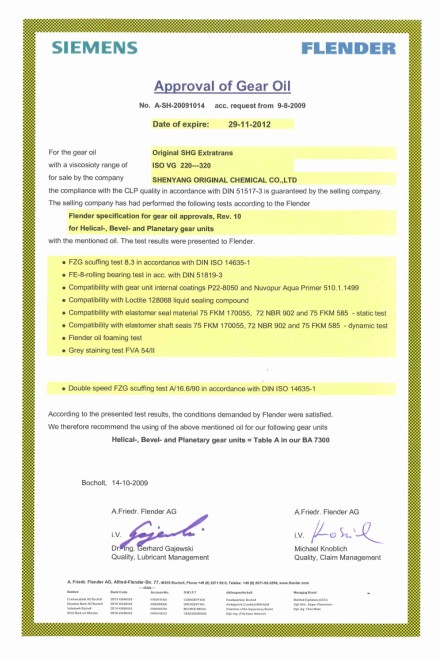 我公司的全合成PAO風(fēng)力發(fā)電專用齒輪油已于2009年10月14日正式獲得德國西門子-弗蘭德公司的認證,今日我司接到了弗蘭德公司的正式通知。弗蘭德是全球最權(quán)威的風(fēng)力發(fā)電機變速箱制造商。我司是國內(nèi)第一家獲此認證的潤滑油公司!