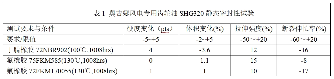 獲得弗蘭德認證的奧吉娜全合成風(fēng)電專用齒輪油SHG320所通過的9項國際權(quán)威機構(gòu)評定中,很重要的一項就是齒輪箱橡膠件的靜態(tài)及動態(tài)相容性試驗,評估結(jié)果如表1和表2所示: