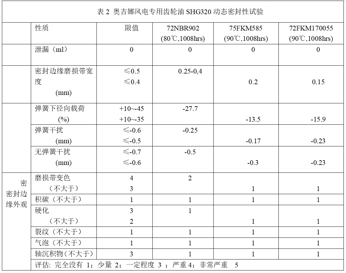 鑒于此,作為世界主要風(fēng)機齒輪箱制造商的弗蘭德公司,在其對潤滑油產(chǎn)品認證評定過程中,采用靜態(tài)潤滑油相容性測試方法的同時,更加注重動態(tài)條件下潤滑油橡膠相容性的測試,其所認證的潤滑油必須滿足Freudenberg試驗要求《Static and dynamic oil compatibility tests with Freudenberg Simmerrings for the approval for Flender gearbox applications》 ,此試驗方法為Freudenberg公司和FLENDER公司共同開發(fā),在轉(zhuǎn)速為1500轉(zhuǎn)/分鐘的試驗機內(nèi),通過測試前后,潤滑油的泄露體積,密封邊緣的磨損帶寬度,軸磨損深度,積碳,起泡,裂紋等現(xiàn)象的觀察和測量評估潤滑油對橡膠的相容性,能夠更好的模擬風(fēng)電齒輪油實際運行狀況,是目前評定潤滑油相容性最科學(xué)、最合理的方法。